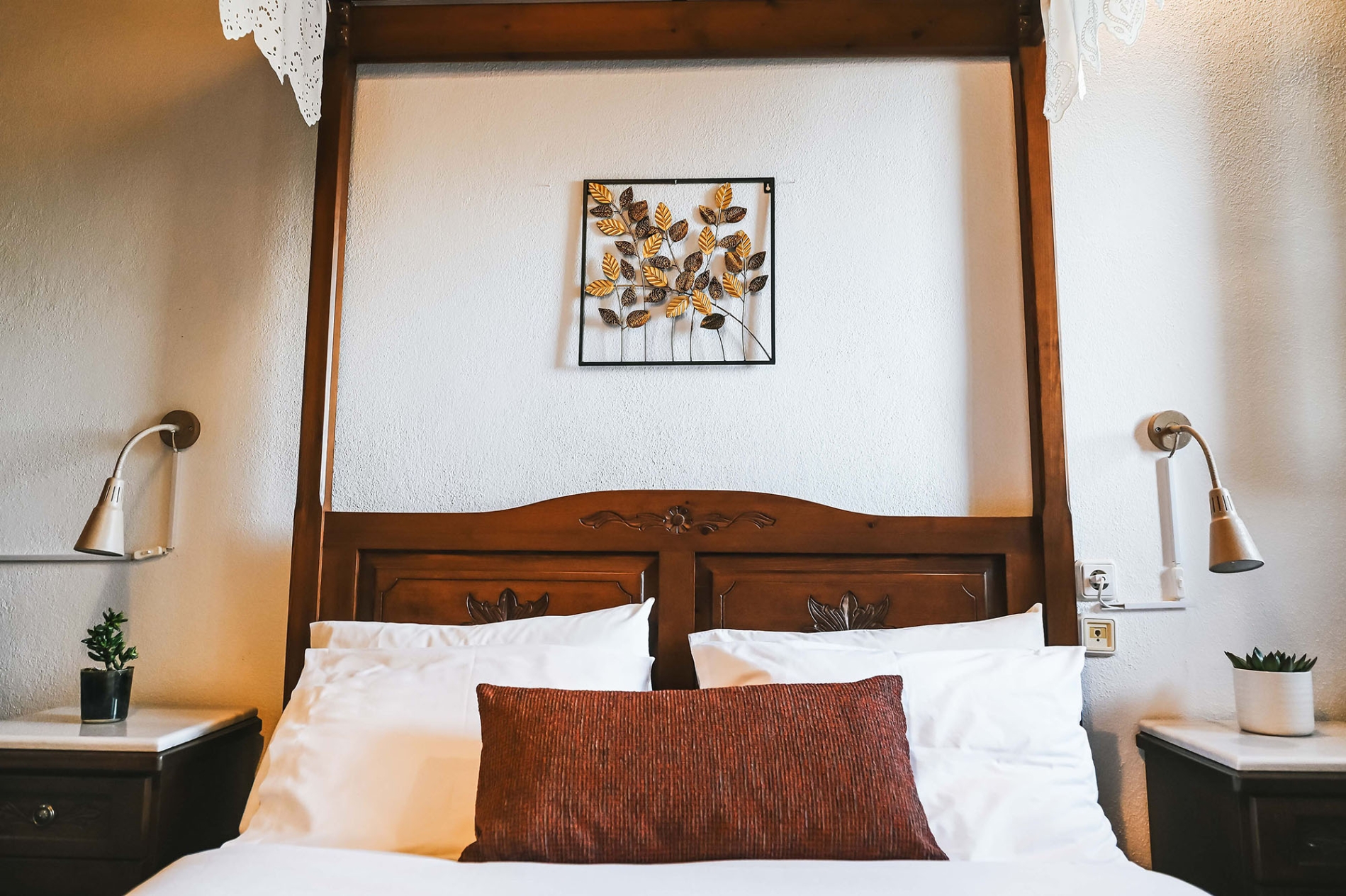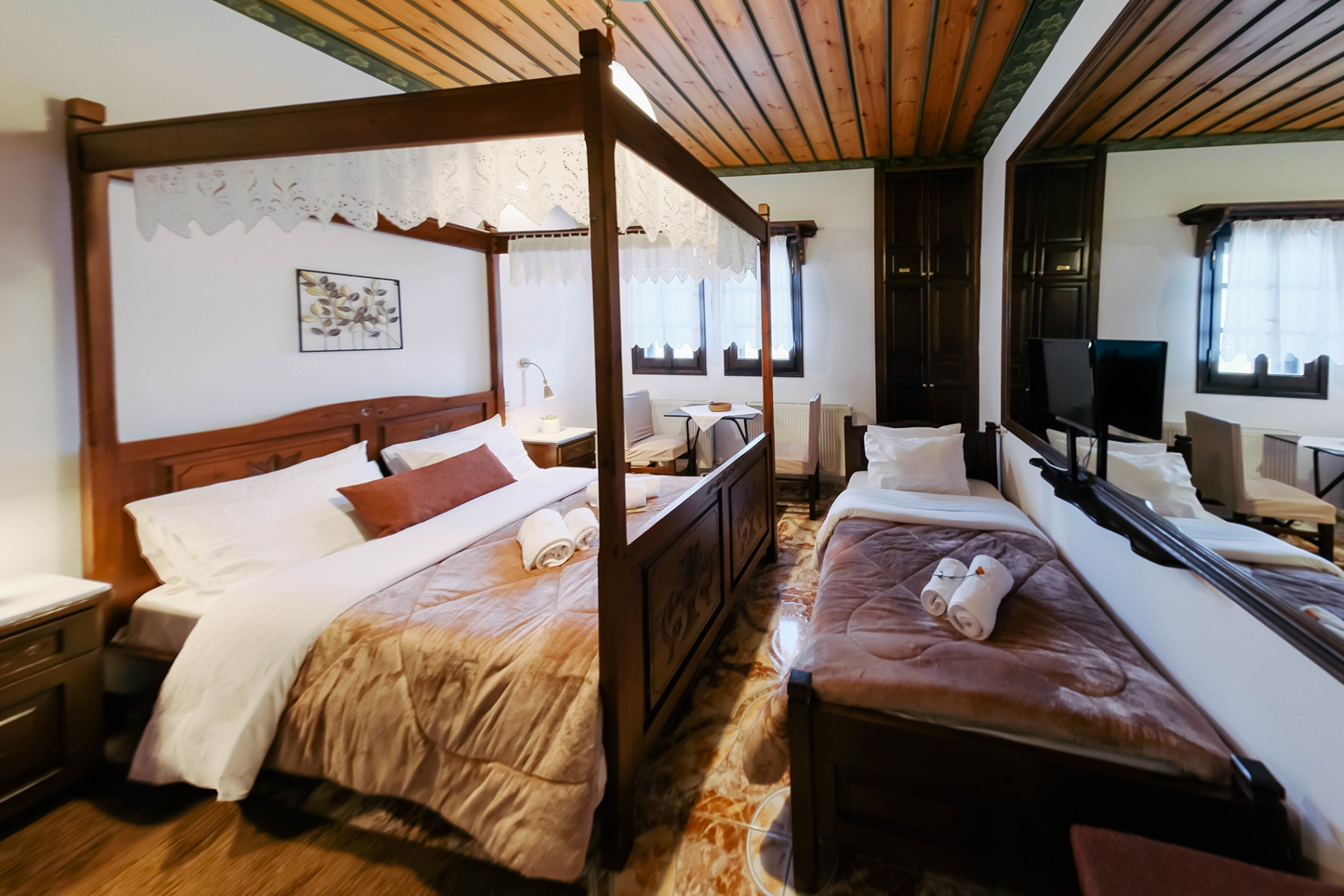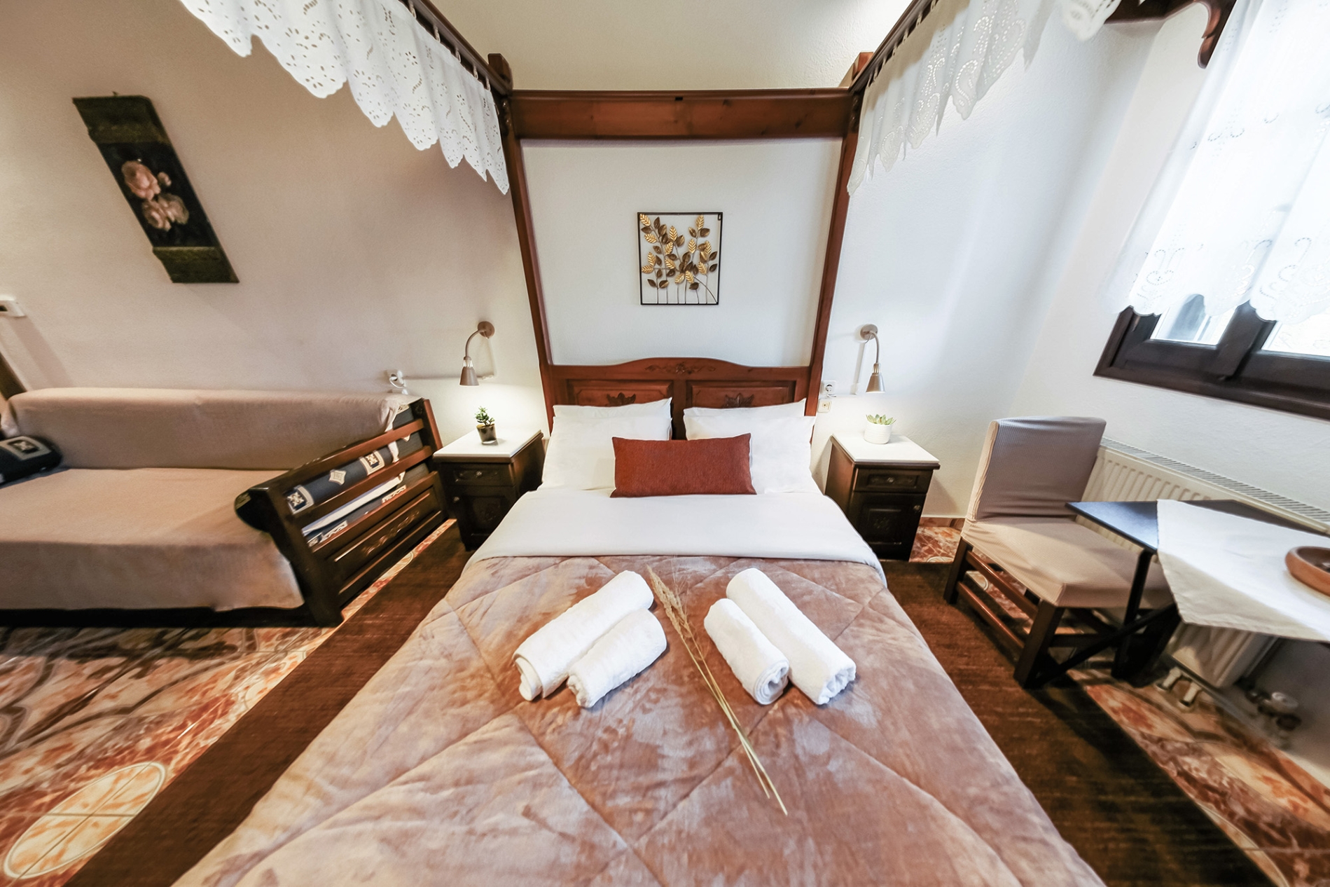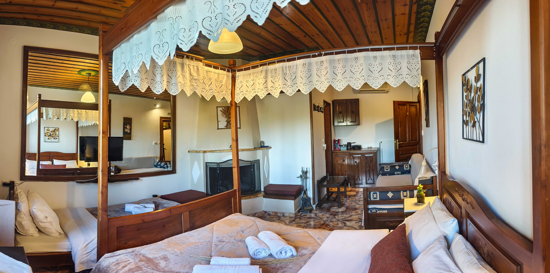 - Κρεβάτι με ουρανό, που προσδίδει αρχοντική αίσθηση στον χώρο